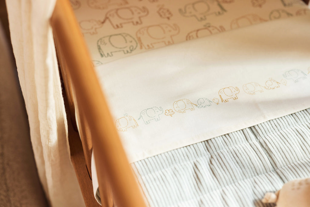 Mit einem Spannbettlaken ist die Matratze in der Wiege oder im Gitterbett vor Flecken schützt.