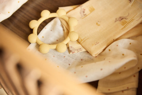 Dieser Silikon-Beißring in Sonnenform ist ideal in der Zahnungsphase. Leicht zu greifen, mit verschiedenen Strukturen, die das Zahnfleisch beruhigen. Hergestellt aus 100 % BPA-freiem Silikon, sicher zum Kauen. Praktisch und verspielt – ein Must-have in den ersten Monaten!
