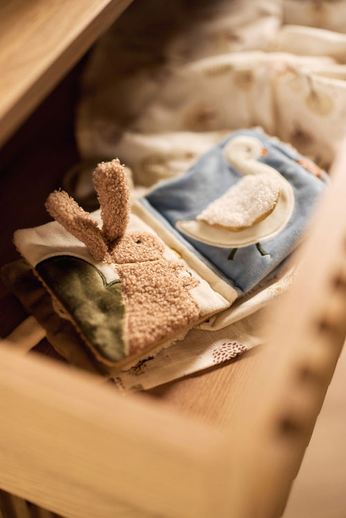 Dieses weiche Aktivitätsbuch aus der Tiny Park Kollektion wurde speziell entwickelt, um die Sinne deines Babys zu stimulieren. Das Buch besteht aus vier Seiten, jede mit einem niedlichen Tiermotiv wie einem Hasen, Vogel, einer Ente oder einem Schwan. Die Seiten enthalten knisternde Materialien, die zum Entdecken und Spielen einladen. Ein Spiegel und kleine Bäumchen auf den Seiten machen das Buch noch spannender. Ein perfektes Spielzeug zur Förderung der Sinne und der Motorik deines Babys!
