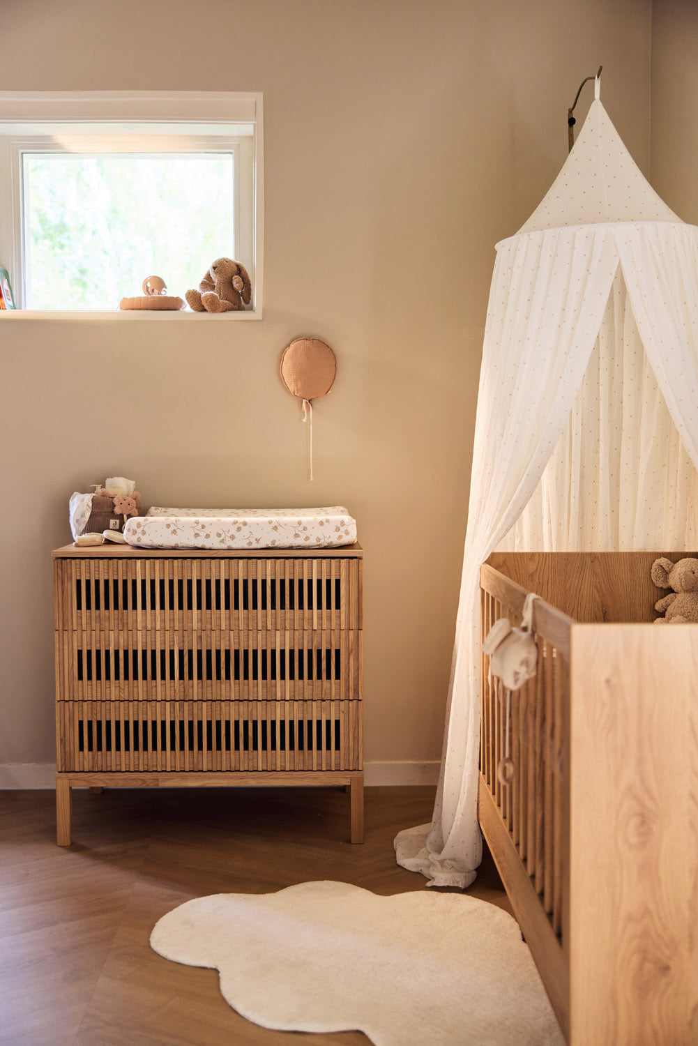 The mosquito nets and canopies are available in the most trendy colours to match any nursery. If your children are a bit older, you can also create a cosy play area with a mosquito net. Hang up a nice mosquito net, put a teddy or knitted playpen mat on the floor and finish off the corner with a children's armchair from our collection. A guaranteed visual and functional success!