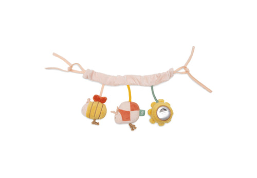 This colorful pram chain from the Pretty Picnic theme is the perfect travel companion! The sun features a small mirror so your little one can discover themselves, the bee makes a fun crinkling sound, and the ladybird contains a soft bell inside. Together, they provide endless visual and sensory fun during every outing!