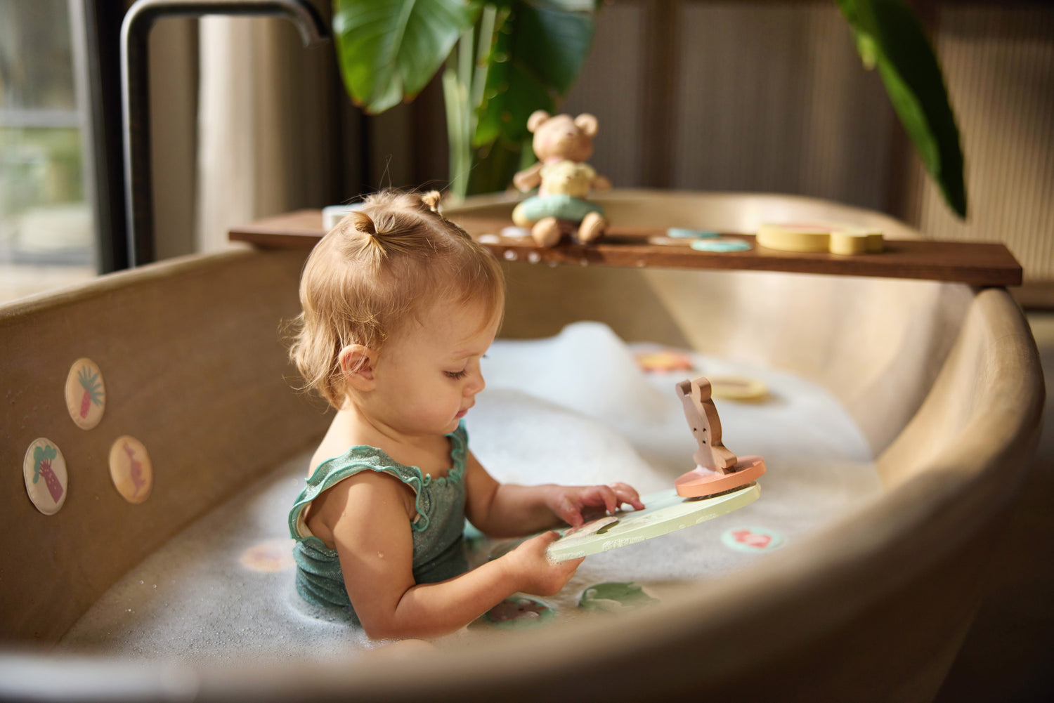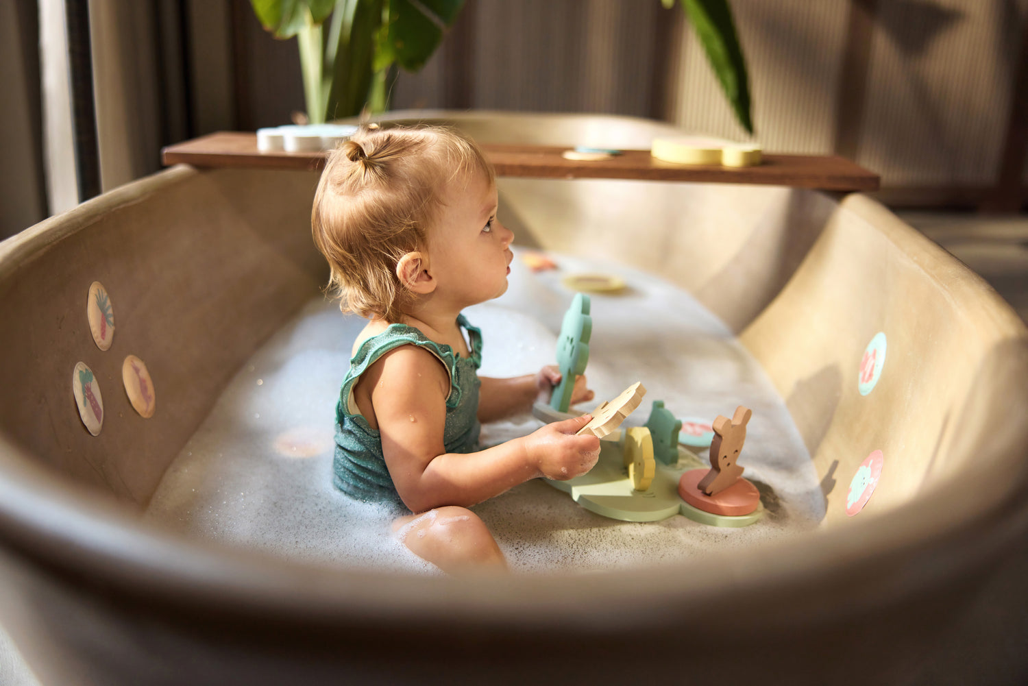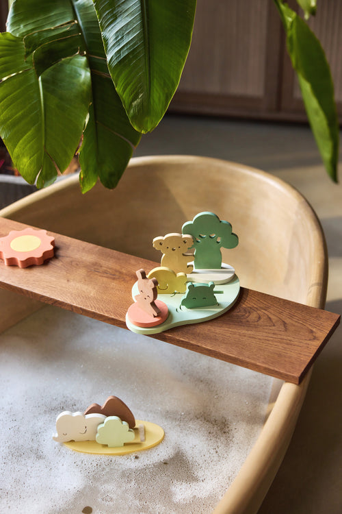 Met deze foam badspeelset bouwt je kindje zijn eigen wereld in bad. Hoe leuk is dat!? De losse puzzelstukken blijven drijven en kunnen eenvoudig in elkaar gezet worden. Zo heeft je kleintje iedere keer een nieuw setje om mee te spelen. Na het badderen goed drogen en berg alles gemakkelijk op in het netje. Dankzij de zuignappen hang je dit handig aan de rand van bad of douche. Zo blijft alles bij elkaar en is het meteen klaar voor de volgende keer.