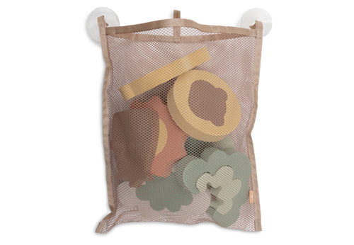 Badtijd! Deze puzzel maakt van badtijd speeltijd. De zachte foam stukken blijven drijven in het water en plakken tegen de natte wand van bad of douche. Zo kan je kindje de vormen keer op keer verschuiven en opnieuw puzzelen, de combinaties zijn eindeloos. Niet alleen gezellig, maar ook goed voor de ontwikkeling van je kleintje. Terwijl je kindje speelt, oefent het ongemerkt de fijne motoriek en het herkennen van vormen. Na gebruik goed drogen en gaat alles terug in het handige netje. Dankzij de twee zuignappen hang je dat aan de rand van bad of douche. Zo blijft alles bij elkaar en is het meteen klaar voor de volgende keer.